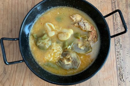Encara no hi ha puntuacions Mig conillMig pollastre1 kg de favesMig quilo de carxofes400 g d’arròsSalSafrà1 litre i mig d’aigua200 cl d’oli