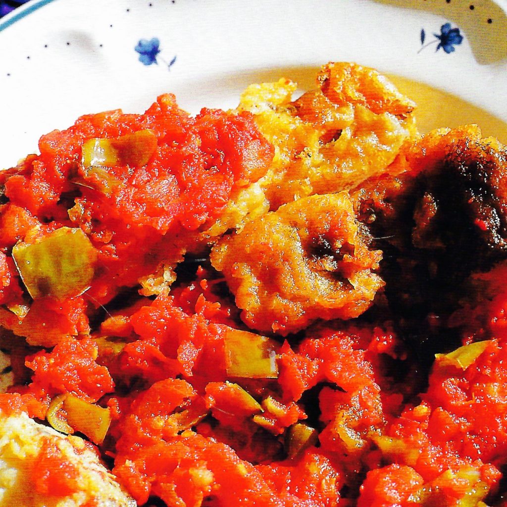 - Poseu l’abadejo en una font i cobriu-lo amb la tomaca.