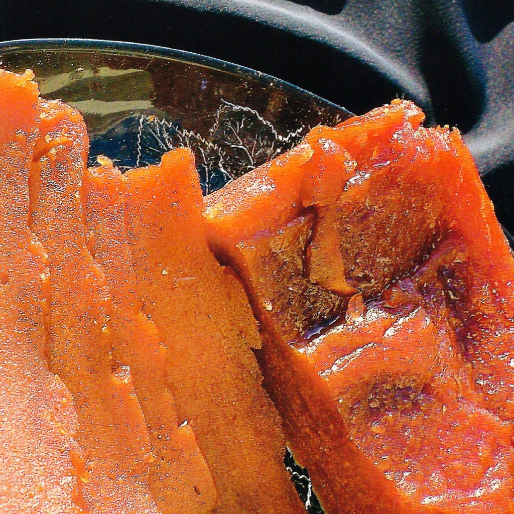 La Cydonia cydonia és una fruita gran que té una carn molt aspra i surenca. Aquest dolç ha sigut molt apreciat des de temps històrics, uns autors diuen que era originari de Pèrsia, i altres, de Cydonia, a l’illa de Creta. Els grecs l’admiraven molt i l’oferien a Afrodita, els romans el menjaven torrat o cuit amb mel i en els receptaris catalans de 1520, apareix cuit amb fruites seques i llet d’ametles. A més, els marquesos d’Albaida tenien gran gust de menjar-ne
