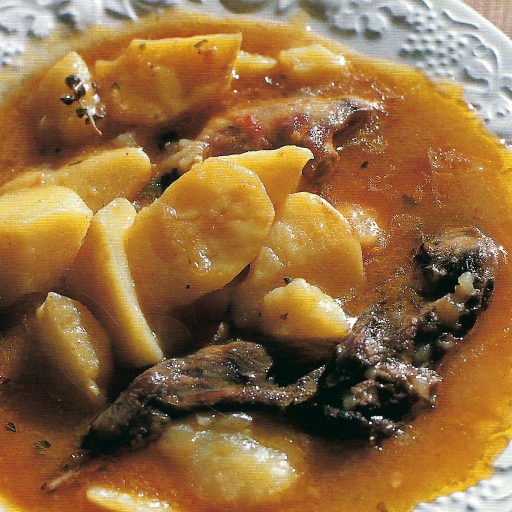 0/ 0 passos fets- Sofregiu el conill, la ceba i la tomaca. Després ompliu-ho d’aigua i deixeu-ho coure.