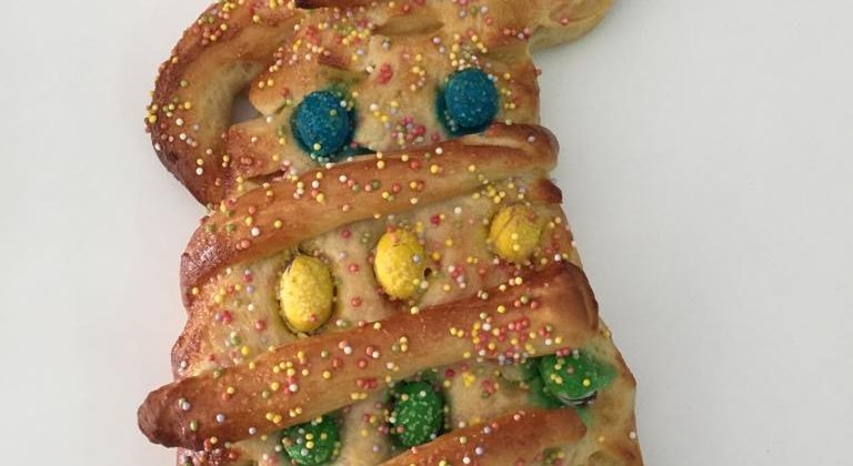 - Precalfa el forn a 200 °C. Després agafes la massa i fas boletes xicotetes com si foren “mandonguilles de carn”. Tira un poc de farina en el banc, fas tres boletes i les estens com si foren *rosquilletas allargades, juntes les tres tires i fas una trena, després amb la mà li fas la forma del “gaiato”.