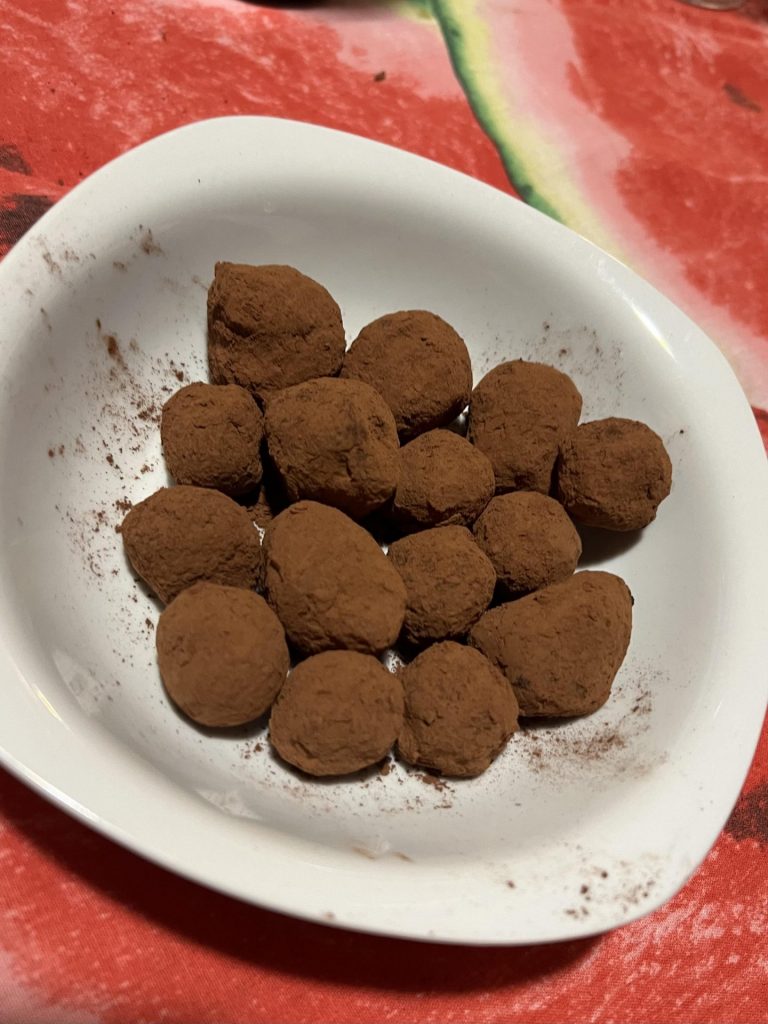 - Feu boletes amb la massa de xocolate i passeu-les per xocolate en pols o ratllat.